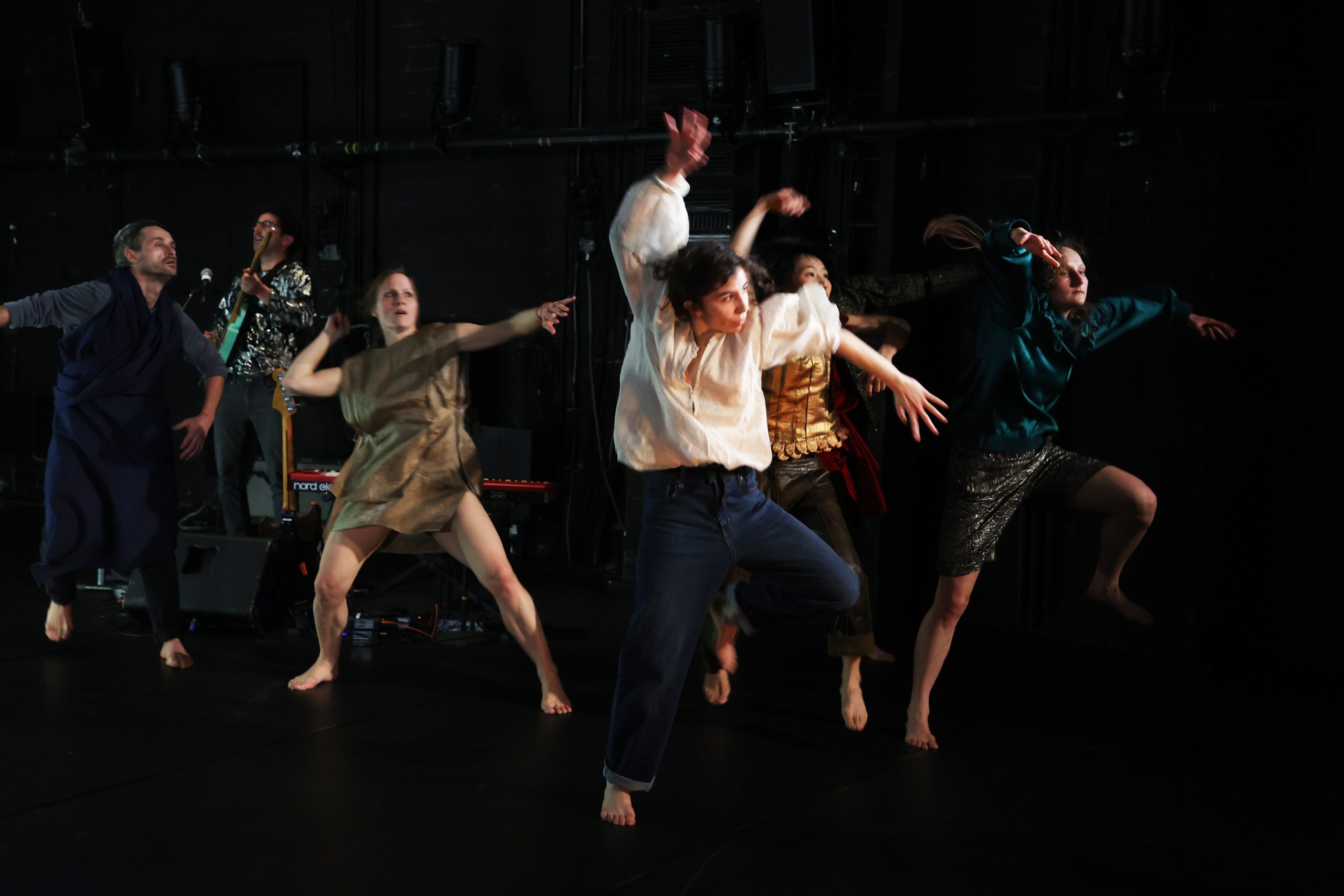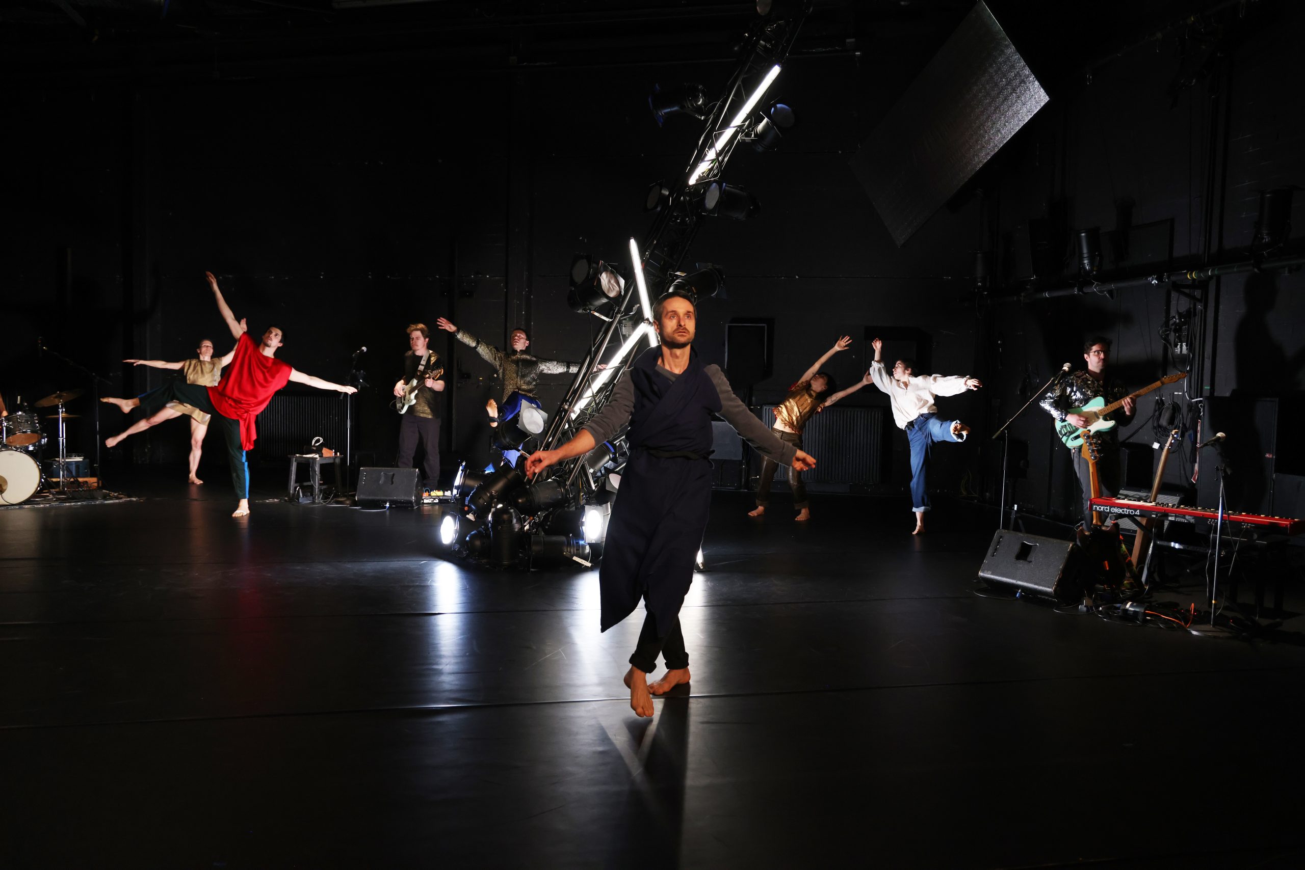 “Op het podium zijn er in een halve cirkel muziekeilanden, vijf punten waarop de muzikanten met hun instrumenten staan opgesteld. In het midden staat een lichtkunstwerk dat zowel een installatie als een elektrisch kampvuur zou kunnen zijn, en daartussen bewegen de zeven dansers zich. En ze bewegen echt veel, dansen voor en met zichzelf. Af en toe zijn er ook korte momenten van synchroon dansen, iets wat ik hier op het podium van het Kleines Haus eigenlijk al tijden lang niet meer heb gezien en wat me er me er gisteravond steeds weer aan herinnerde dat ik bij een dansvoorstelling was en niet bij een concert in een kleine club.”
